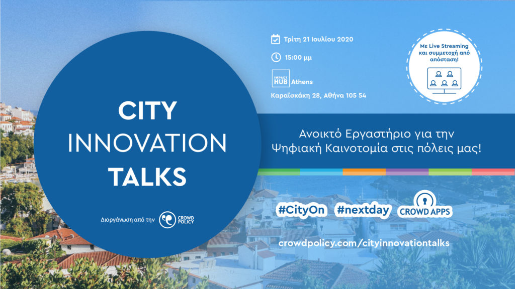 To 1o City Innovation Talks θα πραγματοποιηθεί στις 21 Ιουλίου 2020 στις 15:00 στο Impact Hub Athens στο Μοναστηράκι καθώς και απομακρυσμένα με την χρήση εργαλείων τηλεδιάσκεψης.